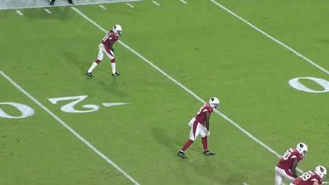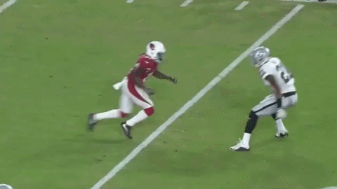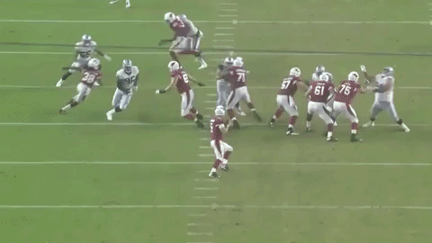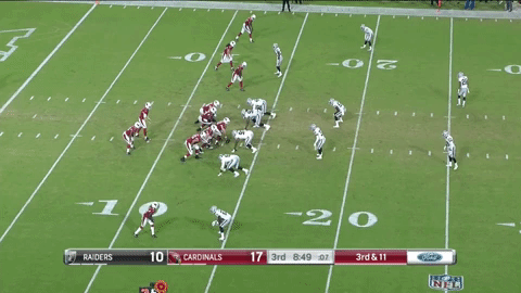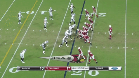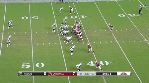 Sin embargo, Denico Autry (96) de los Raiders de Oakland tiene otros planes, al invadir el backfield de los Cardenas y romper completamente la jugada. Denico parece dirigirse originalmente a la zona de la pantalla y tiene que hacer un pequeño ajuste de dirección antes de atacar a mariscal de campo. Autry salta y trata de atrapar a Gabbert que escapa por un pequeño margen;